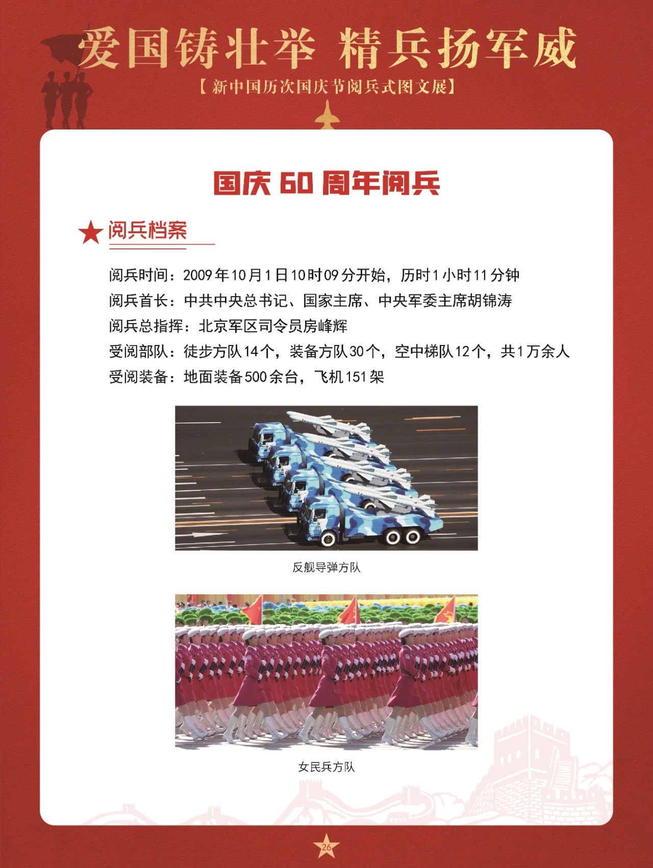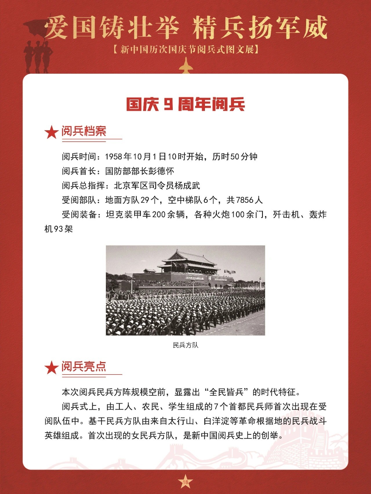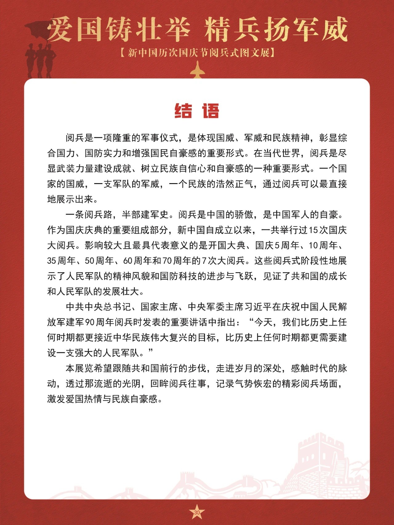 《左传》有云:“国之大事,在祀与戎。”阅兵是一个国家集中展现其国防工业实力、军事科技水平及军队精神面貌的重要窗口。阅兵式是指首长或贵宾在阅兵指挥员的陪同下,乘车、骑马或步行,从受阅部队队列前通过,进行检阅。分列式是指受阅部队从检阅台前通过,接受首长或贵宾的检阅。纵览阅兵路,浓缩建军史。新中国成立后进行的15次国庆阅兵,规模宏大,气势磅礴。中共中央总书记、国家主席、中央军委主席习近平在庆祝中国人民解放军建军90周年阅兵时发表重要讲话:“历史充分证明:我们的人民军队不愧是听党指挥的英雄军队,不愧是忠心报国的英雄军队,不愧是为中华民族伟大复兴英勇奋斗的英雄军队。我们党为拥有这样的英雄军队感到骄傲和自豪!全国各族人民为拥有这样的英雄军队感到骄傲和自豪!” 2024年国庆节,我们特别策划了“爱国铸壮举精兵扬军威一一新中国历次国庆阅兵式图文展”。展览再现了新中国过去15次国庆阅兵的壮观景象,全面展示了新中国武装力量自主创新、阔步走向现代化的辉煌足迹,展现了新中国成立以来国防和军队建设及武器装备发展的重大成就,充分表明了中国军队捍卫国家安全和发展利益、维护世界和平的坚强决心,体现出中国军队的光荣、自信和责任担当,以及一个大国走向世界的坚定步伐。
