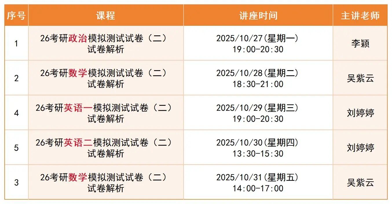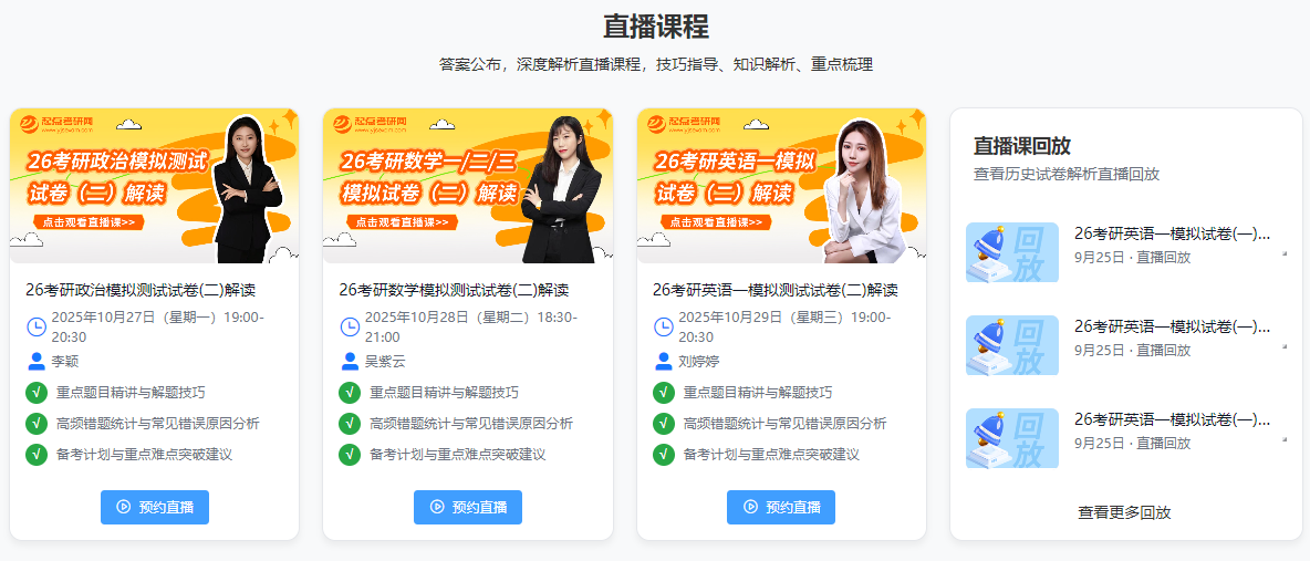 模考的意义从不是 “刷分数”,而是 “补漏洞”!针对10月每一套模考试卷,我们都安排了考研讲师专属解析讲座,不只是简单对答案,更会深入拆解: