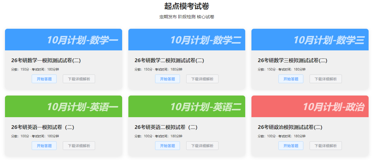 不用再为错过集中模考遗憾,也不用等几天才出批改结果 —— 只要登录起点考研网10月模考专属页面,随时随地都能开启答题,复习节奏完全由你掌控!
