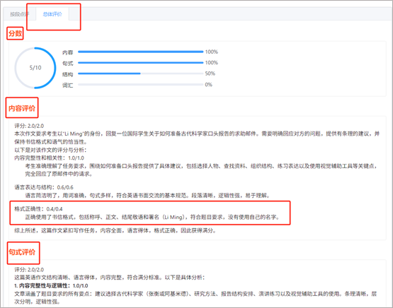 总体评价:分数、内容评价、句式评价等。