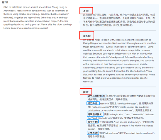 英语作文会标记出 “时态错误”“连接词使用不当” 等具体问题,并推荐替换句式。