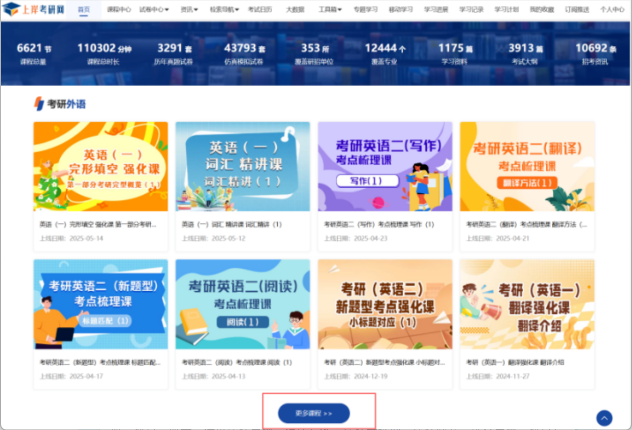 (2)或者在本数据库首页的专辑版块(例如:考研政治、考研外语、考研数学、文史哲类等等)下方,点击“更多课程”找到课程学习资源。