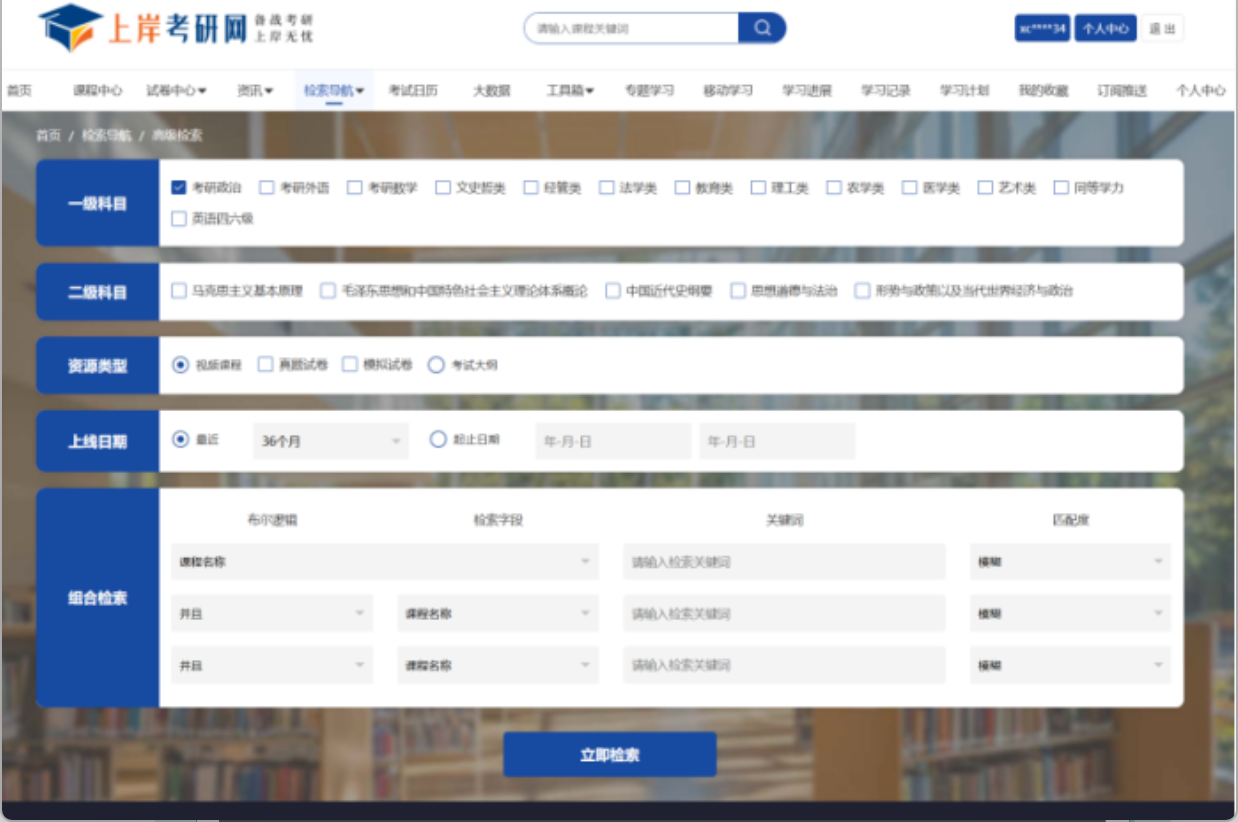 (3)使用本数据库所提供的各种检索功能,如快速检索、标准检索、高级检索、名师导航、科目导航等。提供课程名称、授课专家、课程关键词、课程简介、试卷名称、科目专辑、资源类型、上线日期、布尔逻辑组合检索等检索字段,支持对检索字段进行模糊匹配与精确匹配。