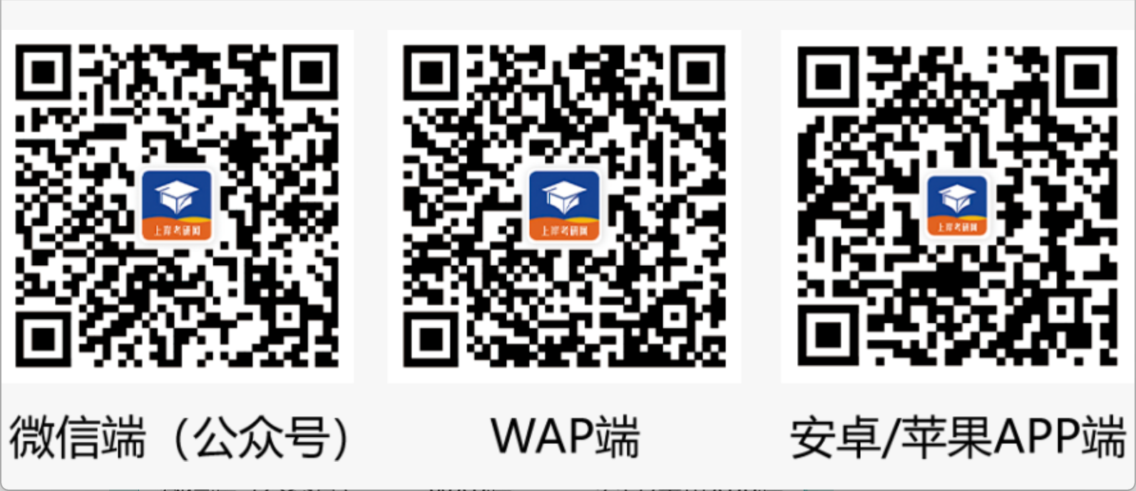 2.移动端使用方法:通过手机扫描下方二维码,关注微信公众号使用“上岸考研网”微信端,或下载APP使用。请注意:使用移动端时,须先通过校园网IP注册账户(该账户将自动升级为不限IP的移动端账户),并以该账户登录移动端。