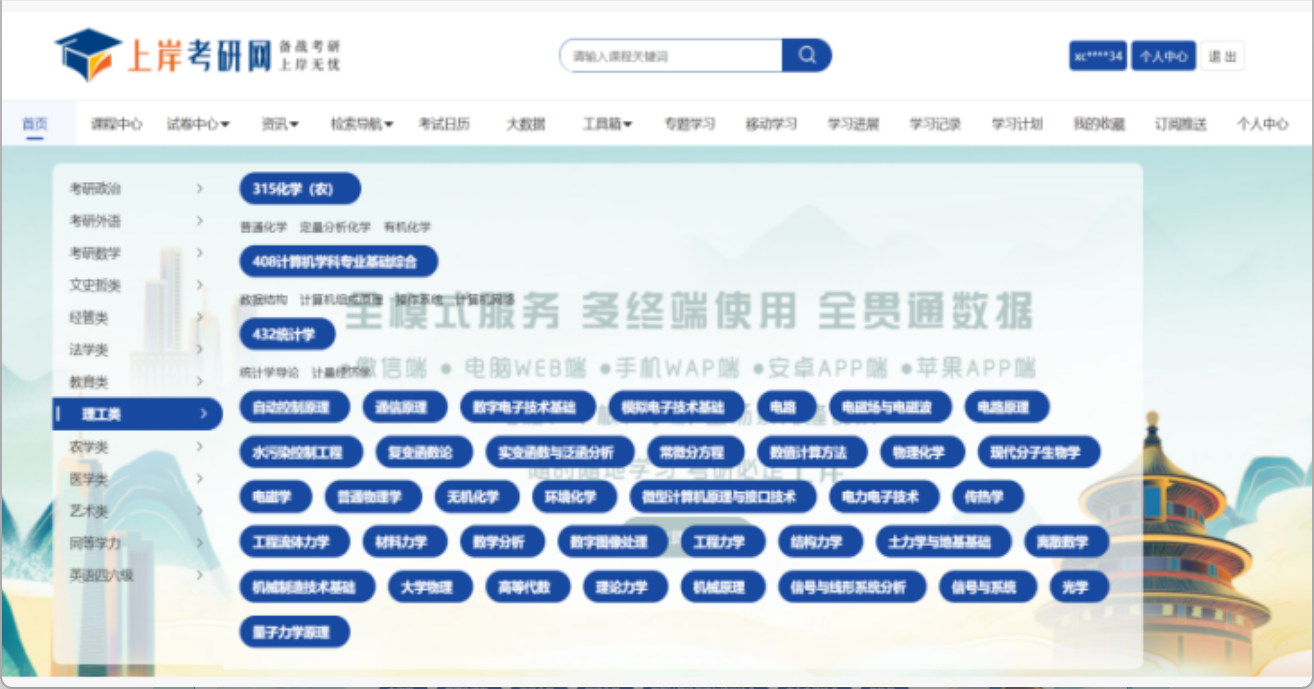 依托橙啦、中公等三十余家全国知名考研辅导机构的权威师资力量,“上岸考研网”现已涵盖了考研政治、考研外语、考研数学、学硕、专硕、同等学力等十三大类百余个考研科目,课程体系涵盖精讲课、强化课、真题课、冲刺课等全阶段视频课程,并提供了历年真题试卷、仿真模考试卷、AI智能知识图谱、官方考试大纲、招考资讯等资源,构建出从知识导入到能力提升、从单科突破到系统整合、从基础夯实到实战演练的全科目、全方位、全周期、全场景、全要素的智能化考研学习生态系统。
