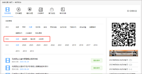 按阶段筛选:在课程页面选择 “导学 / 基础 / 强化 / 冲刺” 阶段,精准定位当前需要的内容。