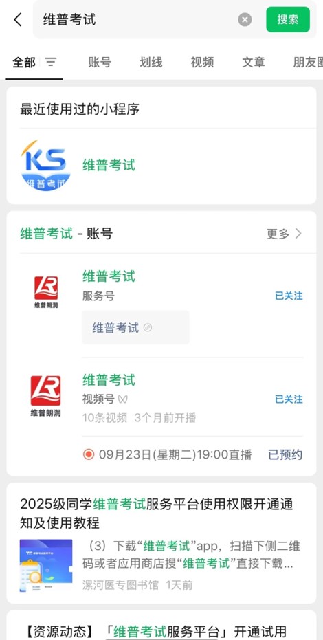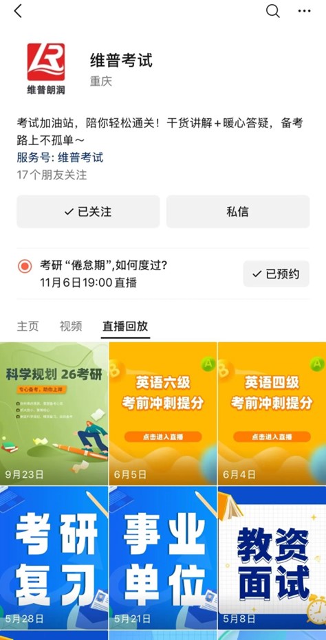 直播结束后生成回放,微信搜索“维普考试”视频号,进入视频号,点击“直播回放”,即可观看。
