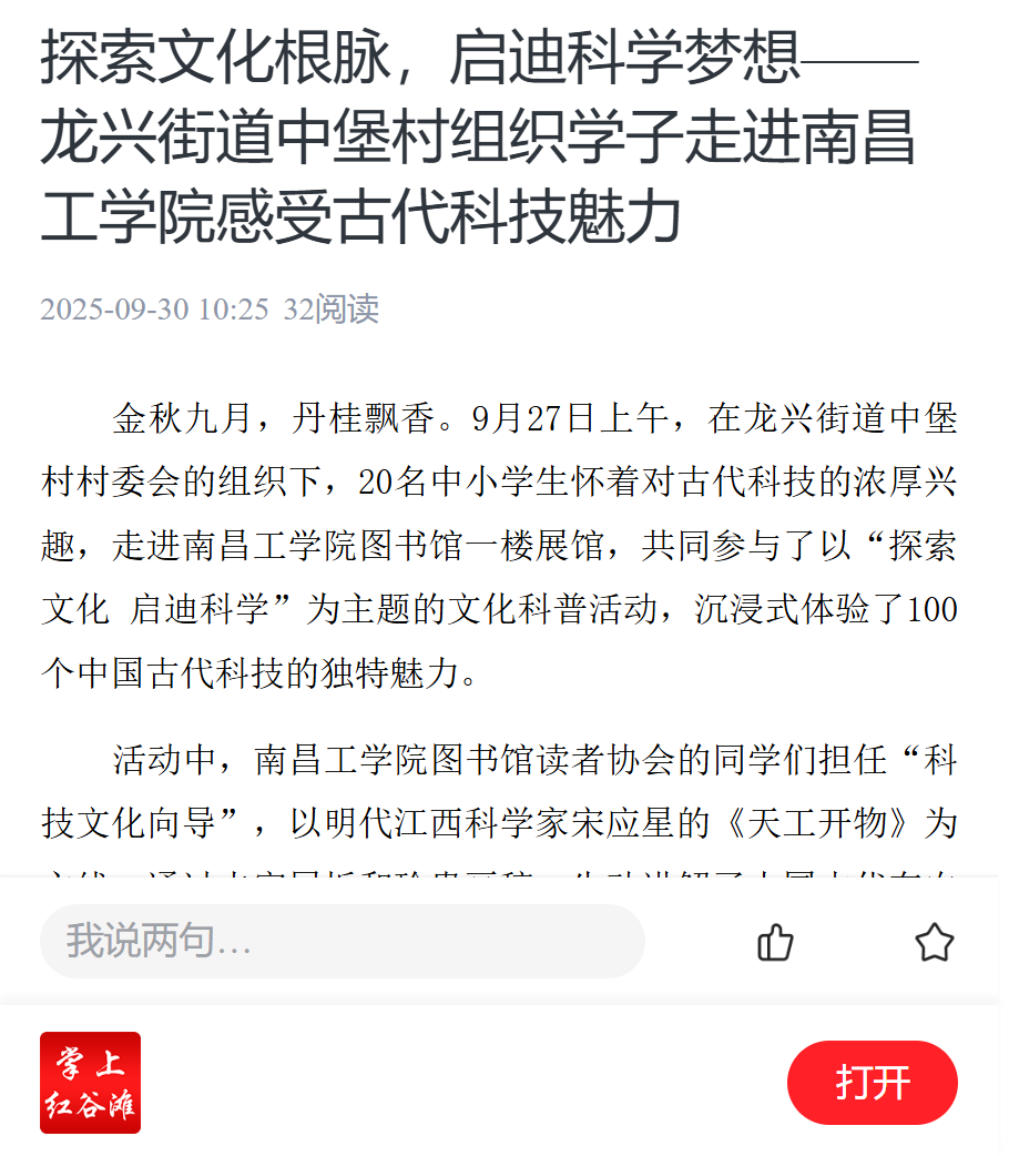 2025年9月27日上午南昌工学院图书馆联合龙兴街道中堡村村委会共同举办“探索文化 启迪科学”为主题的文化科普活动。旨在为中小学生搭建走近中华优秀传统文化、激发科学兴趣的平台,助力孩子们在科技与文化的浸润中茁壮成长。